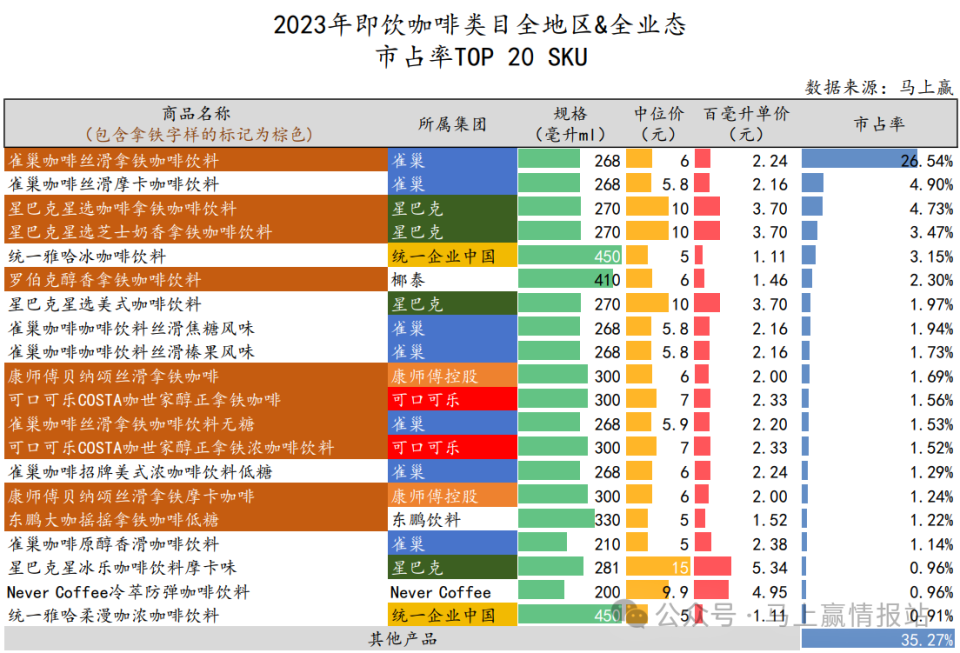 首先是即饮咖啡这个赛道挤满了大牌玩家。雀巢、娃哈哈、东鹏饮料、可口可乐、康师傅、星巴克、统一、旺旺、三得利、隅田川、伯爵等品牌都在跃跃欲试,有三万多家店的瑞幸咖啡在即饮赛道上仍然只能算作“新兵”,缺乏终端与渠道资源的沉淀。