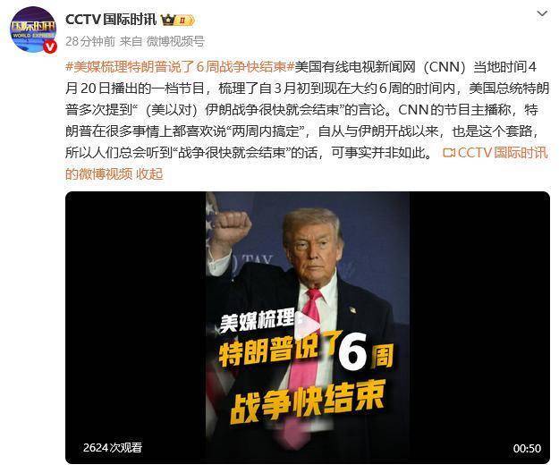 美国有线电视新闻网(CNN)当地时间4月20日播出的一档节目,梳理了自3月初到现在大约6周的时间内,美国总统特朗普多次提到“(美以对)伊朗战争很快就会结束”的言论。CNN的节目主播称,特朗普在很多事情上都喜欢说“两周内搞定”,自从与伊朗开战以来,也是这个套路,所以人们总会听到“战争很快就会结束”的话,可事实并非如此。